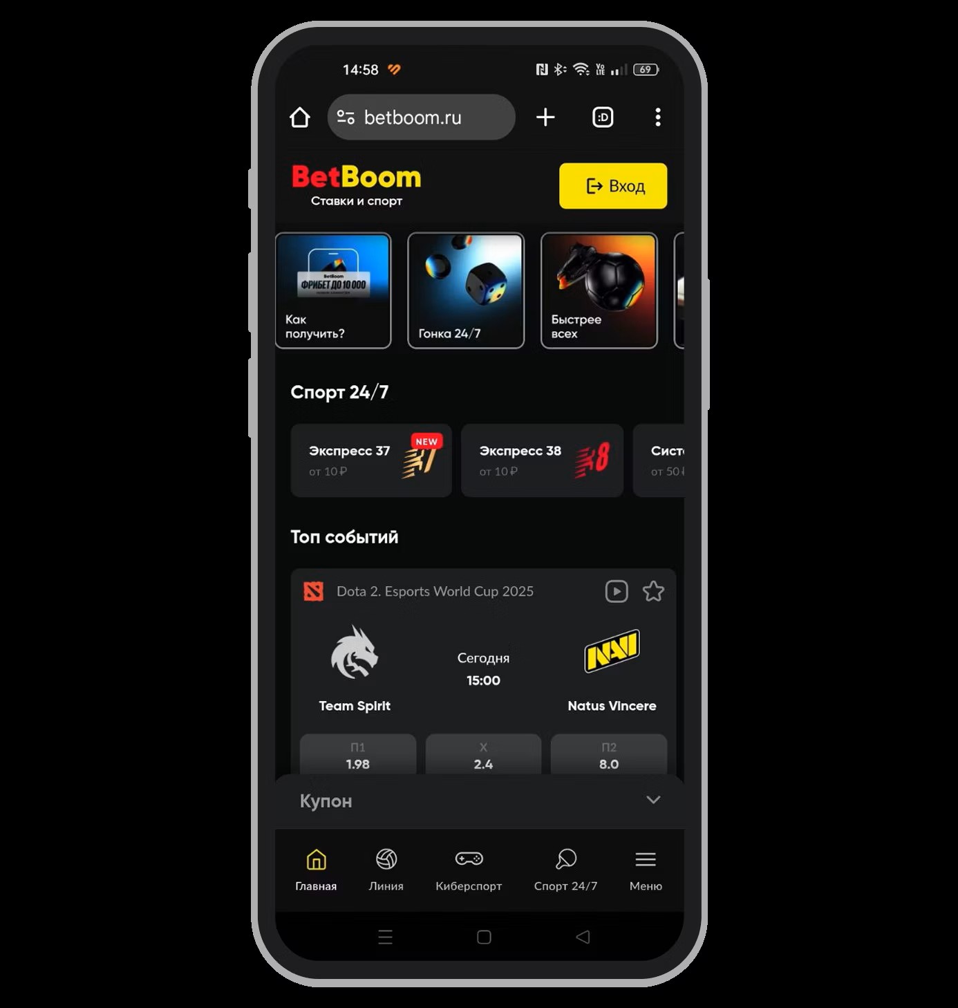 - Крупнейший игрок в киберспорте: глобальный спонсор Team Spirit, собственной организации BetBoom Team, трансляций топ-турниров по Dota 2 и CS2 (включая BLAST и другие Tier-1 события).