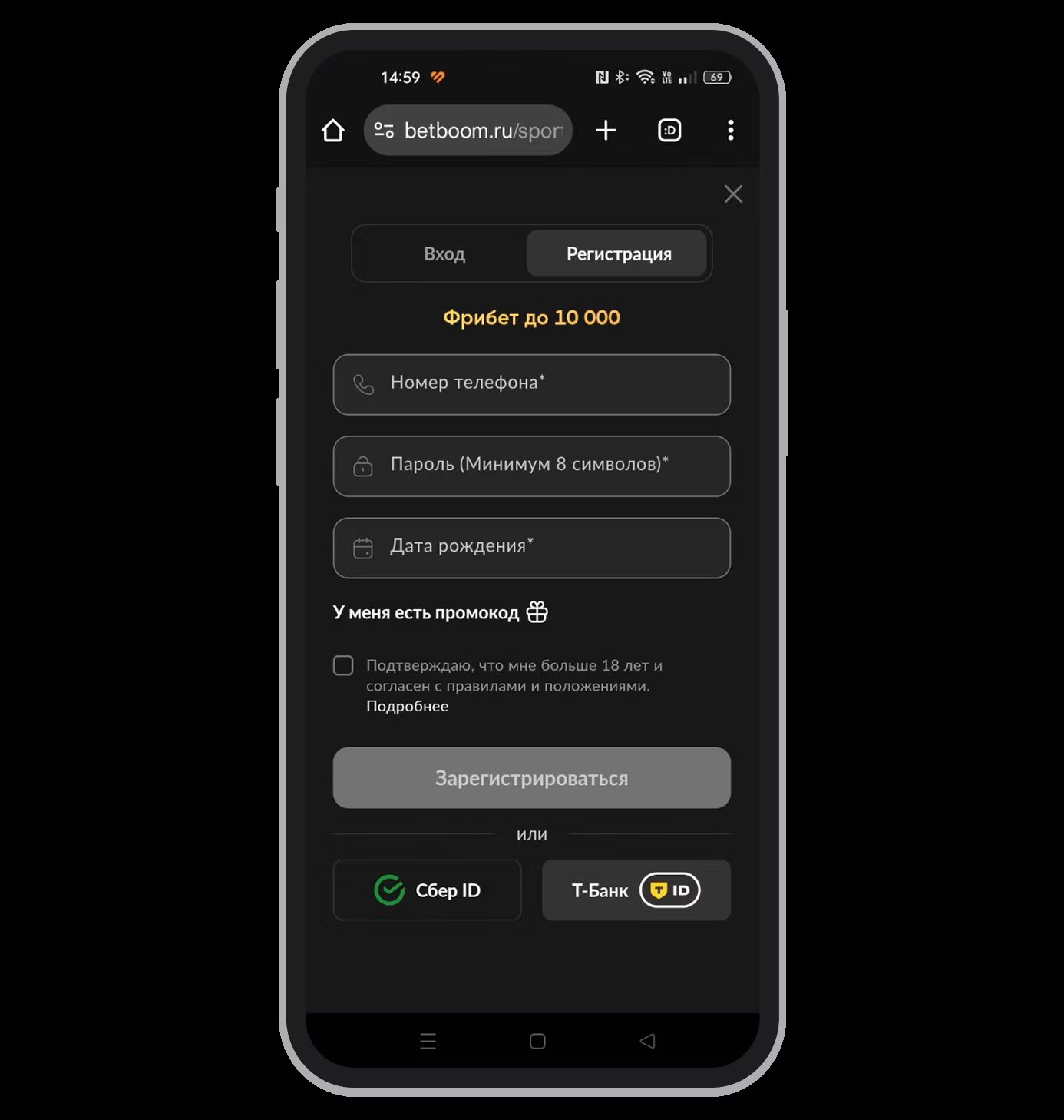 - Регистрация — по телефону + СМС-код + дата рождения + пароль.