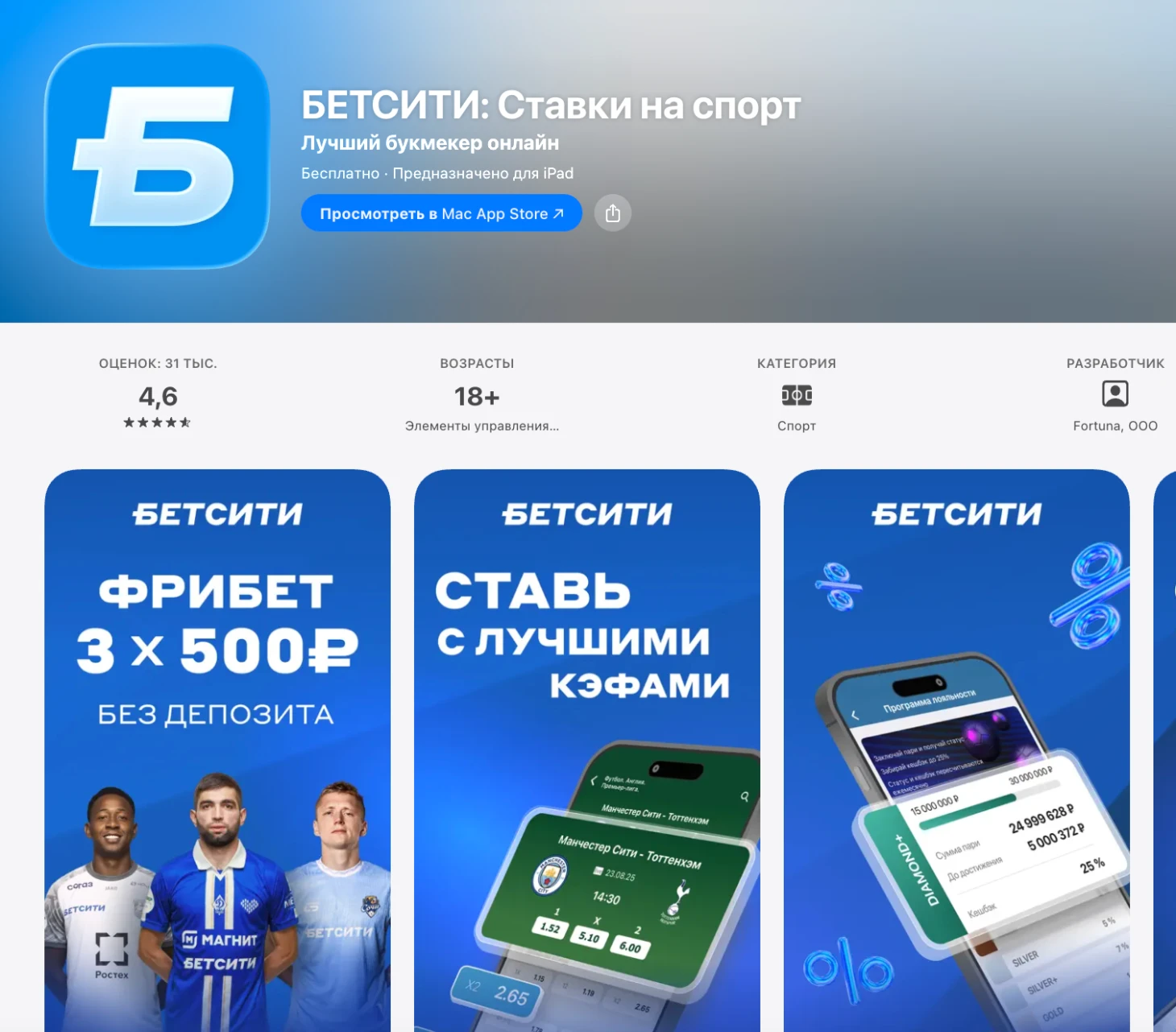 - Нажмите → вас перенаправит в App Store на страницу «БЕТСИТИ — Ставки на спорт».