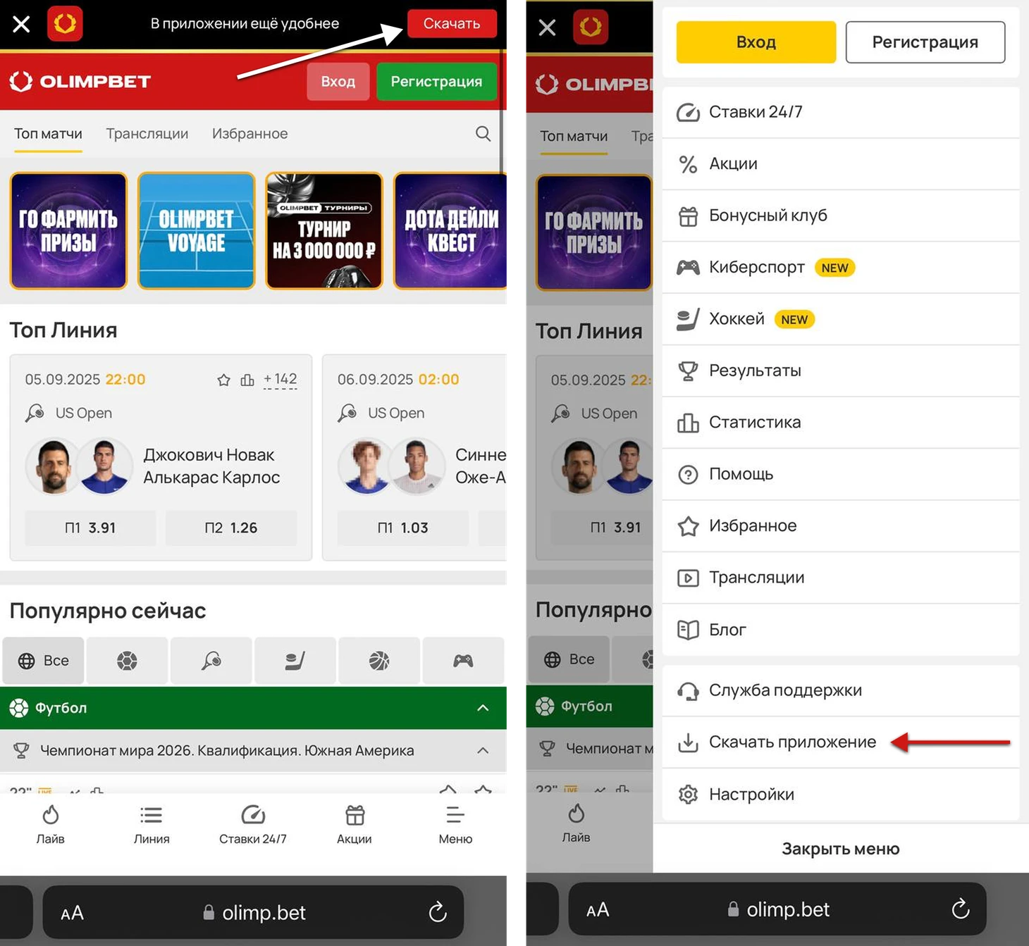 • Если баннер пропущен — откройте меню в правом нижнем углу → раздел «Скачать приложение».