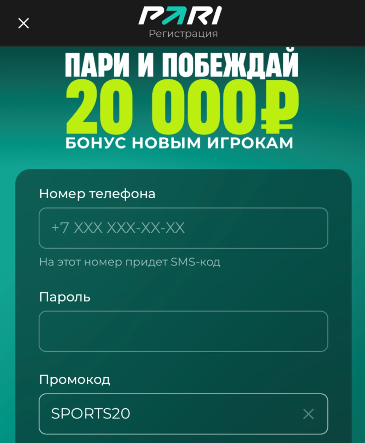 - Введите промокод SPORTS20 (обязательно для фрибета до 20 000 ₽).